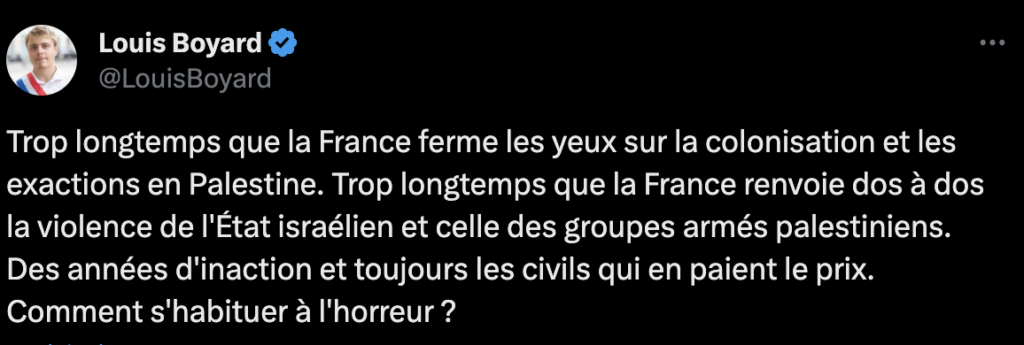 La sénatrice PS Laurence Rossignol a alors directement répondu à Louis Boyard en lui lançant : « Les juifs sont toujours responsables de ce qui leur arrive. C’est une constante du discours antisémite ». De son côté, le député François Ruffin, l’un des candidats potentiels à la présidentielle de 2027, s’est désolidarisé de ses camarades de parti en exprimant « une condamnation totale de l’attaque du Hamas », tout en exprimant ses craintes de savoir que la situation est « dans les mains du gouvernement israélien le plus brutal depuis 30 ans ».