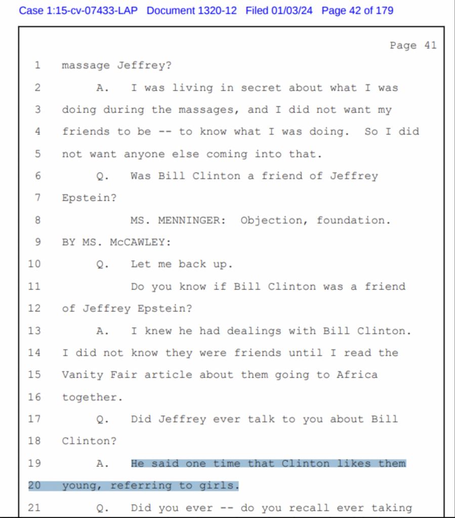 Sur les documents, rien n’indique que l’ancien président a pris part à des actes répréhensibles. Concernant une supposée présence sur l’île, il n’en est rien, comme l’a confirmé Virginia Giuffre, la principale plaignante dans l’affaire Epstein. Dans une déclaration sous serment, Johanna Sjoberg, une accusatrice du financier, a par ailleurs déclaré que l’homme d’affaires qui s’est suicidé en 2019 lui aurait dit que Bill Clinton « les aime jeunes, en faisant référence aux filles ». Bill Clinton aurait coupé les liens avec le couple Epstein-Maxwell en 2005.