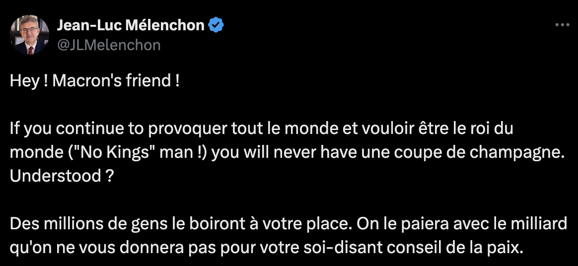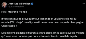 C’est dans ce contexte tendu que Jean-Luc Mélenchon a choisi d’intervenir. Mardi 20 janvier, le leader de La France insoumise a publié un message sur le réseau social X, adressé directement à Donald Trump. Particularité : le message est rédigé en franglais, sur un ton volontairement moqueur. “If you continue to provoquer tout le monde et vouloir être le roi du monde (‘No Kings’ man !), you will never have une coupe de champagne. Understood ?” Avant de conclure : “Des millions de gens le boiront à votre place. On le paiera avec le milliard qu’on ne vous donnera pas pour votre soi-disant conseil de la paix.” Une manière pour Mélenchon de dénoncer à la fois la logique financière du projet américain et l’usage des sanctions économiques comme moyen de pression.